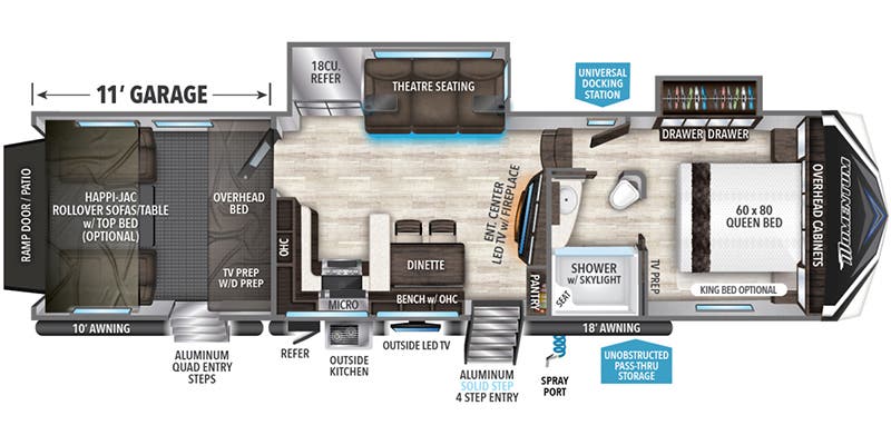 Longueur : 39 pi. Coucher : 7 personnes à coucher Poids : 13 419 Lbs Type d'essence : Aucun Foyer : inclus Cuisinette extérieure : inclus Caméra de recul : inclus Tables et chaises : inclus Banquette : inclus Sofa lit : inclus Fauteuil style théatre : inclus Génératrice : inclus Télévision : inclus Jante aluminium : inclus Mise à niveau auto nivelant : inclus Lit queen : inclus Front cap moulé : inclus Échelle arrière : inclus Préparation laveuse secheuse : inclus Réfrigérateur gaz/électrique : inclus Deuxième A/C 13500BTU : inclus 50 AMP : inclus Lits superposés : inclus Chauffe-eau 12 gallons : inclus Radio bluetooth : inclus Antenne TV : inclus Hauts-parleurs extérieurs : inclus Fourneau : inclus Chauffage 40 000 BTU : inclus Auvent arrière : inclus Poêle 3 ronds : inclus Micro-onde : inclus |