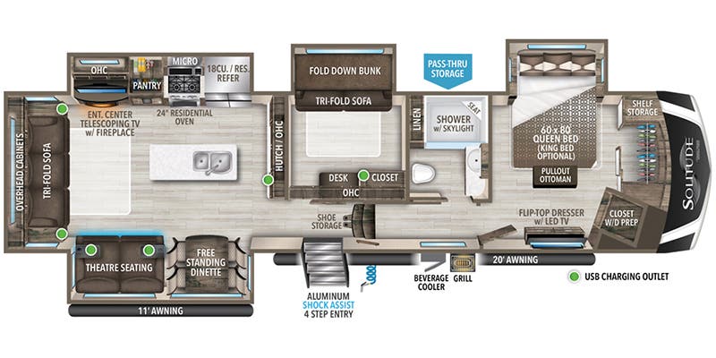 Solitude 378MBS 2022 Vivez le luxe et le confort sur la route avec le Solitude 378MBS 2022, idéal pour les familles nombreuses ou les voyageurs exigeants. Profitez d’un lit king, de lits superposés, d’une chambre enfant fermée, d’un sofa-lit et d’un fauteuil style théâtre pour un espace de vie spacieux et convivial. La cuisine complète avec réfrigérateur gaz/électrique, réfrigérateur au gaz, fourneau, poêle 3 ronds, micro-onde, cellier et ilôt central facilite la préparation des repas, tandis que l’air climatisé 15 000 BTU, le deuxième A/C et le chauffe-eau de 12 gallons assurent un confort optimal en toutes saisons. Pensé pour le divertissement et la vie en plein air, ce Solitude est équipé de télévision dans le salon et la chambre, radio Bluetooth, antenne TV et hauts-parleurs extérieurs. La cuisinette extérieure, l’auvent, les jantes en aluminium, le front cap moulé, l’échelle arrière et la mise à niveau auto-nivelante ajoutent praticité et sécurité. Avec la préparation pour laveuse-sécheuse et le 50 AMP, le Solitude 378MBS 2022 combine luxe, espace et fonctionnalités complètes pour des escapades mémorables et sans compromis.