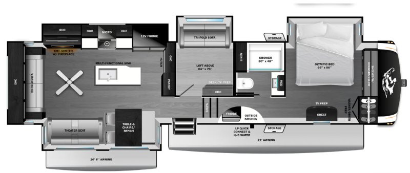 Roamer 35MRQS 2026 – Élégance, espace et confort moderne Le Roamer 35MRQS 2026 est une caravane conçue pour les campeurs qui recherchent un intérieur spacieux, une ambiance haut de gamme et un aménagement moderne favorisant le confort et la convivialité. Son design soigné et ses équipements essentiels en font une unité idéale pour les séjours prolongés. L’aire de vie se démarque par son îlot central, offrant une circulation fluide et un espace pratique pour la préparation des repas. Le salon est chaleureux et invitant avec des fauteuils style théâtre, une télévision et un foyer, créant une ambiance parfaite pour se détendre après une journée d’aventure. La cuisine est bien équipée avec un réfrigérateur 12 volts, assurant efficacité énergétique et performance, tandis que le climatiseur de 15 000 BTU garantit un confort optimal lors des journées chaudes. Le Roamer 35MRQS 2026 est un excellent choix pour ceux qui recherchent une caravane élégante, confortable et bien aménagée, offrant un espace de vie agréable et fonctionnel. Points forts : Roamer 35MRQS modèle 2026 Foyer Îlot central Fauteuils style théâtre Télévision Réfrigérateur 12 volts Air climatisé 15 000 BTU