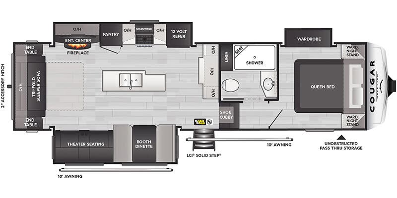 Cougar 29RLI 2025 Vivez l’aventure en toute autonomie avec le Cougar 29RLI 2025, conçu pour allier confort, espace et technologie. Profitez d’un lit queen, d’un sofa-lit, d’une banquette et d’un fauteuil style théâtre pour un espace de vie spacieux et convivial. La cuisine complète avec réfrigérateur 12V, fourneau, poêle 3 ronds, micro-onde et ilôt central rend la préparation des repas simple et agréable, tandis que le foyer, l’air climatisé 15 000 BTU et le chauffage 30 000 BTU assurent confort et ambiance chaleureuse en toutes saisons. Pour vos moments de détente à l’extérieur, cette unité est équipée de deux auvents, d’un panneau solaire 200W, hauts-parleurs extérieurs, radio Bluetooth et douchette extérieure. Le Cougar 29RLI 2025 offre également des fonctionnalités pratiques comme pattes électriques, mise à niveau auto-nivelante, marche-pied, échelle arrière, réservoir chauffé et construction robuste en aluminium et fibre de verre. Avec un 50 AMP, un hitch 2 pouces et des équipements complets pour le divertissement et la vie en plein air, le Cougar 29RLI 2025 combine luxe, technologie et fonctionnalité pour des escapades mémorables et sans compromis.