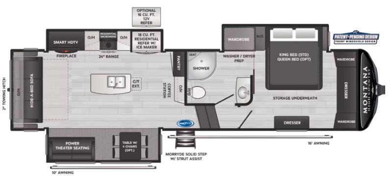 Montana 295RL 2025 – Luxe et confort pour vos voyages Le Montana 295RL 2025 est conçu pour les amateurs de camping qui recherchent espace, confort et équipements haut de gamme, parfait pour des séjours prolongés ou des escapades en famille. Caractéristiques et équipements : Foyer et îlot central pour un intérieur chaleureux et fonctionnel Slide topper et mise à niveau auto nivelant pour plus de stabilité et de confort Air climatisé 15 000 BTU, deuxième A/C 15 000 BTU et chauffe-eau 12 gallons pour un confort optimal en toutes saisons Réfrigérateur 12 Volts, tables et chaises, marche-pied, fourneau, poêle 3 ronds et micro-onde pour une expérience culinaire complète Lit queen dans la chambre principale, avec fenêtres doubles et réservoir chauffé pour plus de confort 50 AMP et pattes électriques pour une autonomie et une stabilité optimales Douche intérieure et douchette extérieure, toilette avec réservoir pour plus de praticité Radio bluetooth, antenne TV, hauts-parleurs extérieurs et éclairage DEL pour le divertissement Deuxième auvent, fantastic fan, panneau solaire 200W et hitch 2 pouces pour profiter pleinement de vos aventures et rester autonome Construction aluminium et gel coat pour durabilité et longévité Le Montana 295RL 2025 allie luxe, confort et technologie, offrant tout le nécessaire pour profiter pleinement de vos escapades avec style et autonomie.