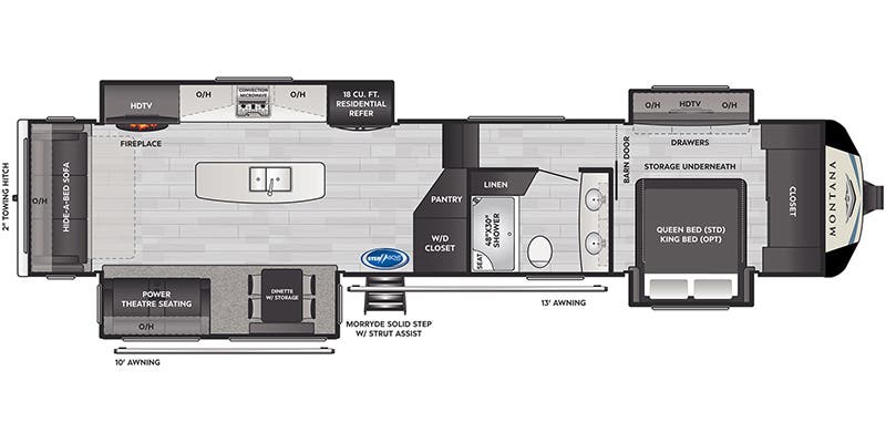Le Montana 3781RL 2021 est un VR haut de gamme, spacieux et richement équipé, conçu pour ceux qui recherchent confort, performance et autonomie lors de leurs escapades prolongées. Avec son aménagement bien pensé et ses multiples équipements modernes, il offre une expérience comparable à celle d’une maison, tout en restant totalement mobile. Points forts : Espace de vie & confort : Ilôt central, tables et chaises, sofa‑lit, fauteuils style théâtre, foyer Climatisation & chauffage : Air climatisé 15 000 BTU, deuxième A/C 15 000 BTU Cuisine & repas : Réfrigérateur gaz/électrique, fourneau, poêle 3 ronds, micro‑onde Divertissement : Télévision principale et télévision dans la chambre, radio Bluetooth, antenne TV, hauts‑parleurs extérieurs Confort & commodités : Mise à niveau auto‑nivelante, chauffe‑eau 12 gallons, balayeuse intégrée Chambre principale : Lit king avec espace généreux Extérieur & robustesse : Slide topper, auvent, jantes aluminium, front cap moulé, échelle arrière
