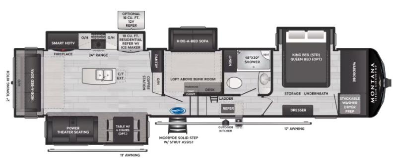 Montana 385BR 2025 – Confort et espace pour toute la famille Le Montana 385BR 2025 est conçu pour les amateurs de camping qui recherchent espace, luxe et autonomie. Idéal pour les familles ou les escapades prolongées, il combine des équipements haut de gamme et une construction robuste. Caractéristiques principales : Foyer, ilôt central et cuisine extérieure pour un intérieur chaleureux et des repas conviviaux Slide topper et mise à niveau auto nivelant pour un confort et une stabilité optimaux Air climatisé 15 000 BTU + deuxième A/C 15 000 BTU, chauffe-eau instantané et chauffage 35 000 BTU pour toutes les saisons Lit king dans la chambre principale et chambre enfant fermée avec lits superposés pour accueillir toute la famille Tables et chaises, sofa lit, fauteuil style théâtre, fourneau, poêle 3 ronds et micro-onde pour un maximum de confort et de commodités 50 AMP, pattes électriques, inverter et hitch 2 pouces pour une autonomie complète et une installation facile Douche intérieure, toilette avec réservoir et douchette extérieure pour la praticité Radio bluetooth, antenne TV, hauts-parleurs extérieurs et télévision pour le divertissement Deux auvents, réservoir chauffé, panneau solaire 200W, construction aluminium et mur en fibre de verre pour durabilité et longévité Le Montana 385BR 2025 offre toute l’expérience du camping de luxe, avec espace, confort et technologie, pour des aventures inoubliables.