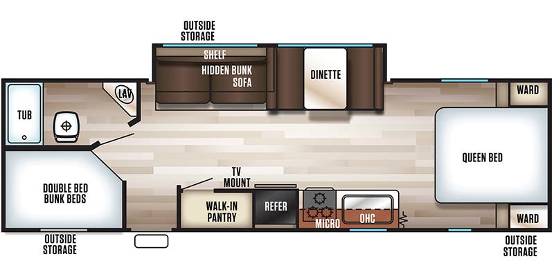 Le Grey Wolf 26CKS 2017 est une roulotte conviviale et bien équipée, idéale pour les campeurs qui recherchent confort et simplicité. Sa configuration ouverte avec divers espaces de couchage et une cuisine complète en fait une excellente option pour les escapades en famille ou entre amis. Points forts : Confort intérieur : Banquette, sofa-lit et lit queen pour un espace de couchage flexible Climatisation & confort thermique : Air climatisé 13 500 BTU et chauffe-eau 6 gallons Cuisine : Réfrigérateur gaz/électrique, poêle 3 ronds, micro-onde Divertissement : Antenne TV, hauts-parleurs extérieurs Extérieur : Auvent pour profiter de l’ombre et des activités en plein air