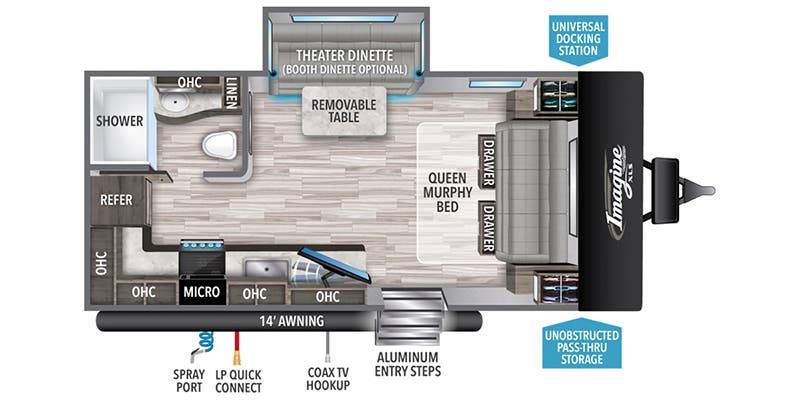 Le Imagine 17MKE 2023 est une roulotte compacte, bien équipée et facile à remorquer, idéale pour les couples ou petites familles qui veulent profiter du camping avec confort et commodité. Avec son aménagement intelligent et ses équipements modernes, elle offre une expérience de plein air agréable sans compromis. Points forts : Confort & couchage : Lit Murphy et banquette pour maximiser l’espace intérieur Climatisation & confort thermique : Air climatisé 15 000 BTU et chauffe‑eau instantané Cuisine & repas : Réfrigérateur 12 V, fourneau, poêle 3 ronds et micro‑onde Divertissement & technologie : Télévision, radio Bluetooth, antenne TV, hauts‑parleurs extérieurs Extérieur & praticité : Slide topper, jantes en aluminium, échelle arrière Énergie & branchement : Connexion 30 AMP
