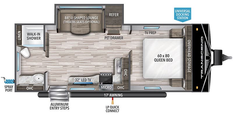 Le Transcend 221RB 2024 est une roulotte compacte et bien équipée, parfaite pour ceux qui veulent une unité simple à remorquer sans sacrifier le confort essentiel. Avec ses commodités pratiques et son aménagement fonctionnel, elle est idéale pour les escapades en couple ou en petite famille. Points forts : Confort & couchage : Lit queen et banquette offrant un espace de repos agréable Climatisation : Air climatisé 15 000 BTU pour une température idéale à l’intérieur Cuisine & repas : Réfrigérateur 12 V, poêle 3 ronds et micro-onde Divertissement : Télévision, radio Bluetooth, antenne TV Confort thermique : Chauffe‑eau 6 gallons Extérieur & praticité : Auvent, échelle arrière