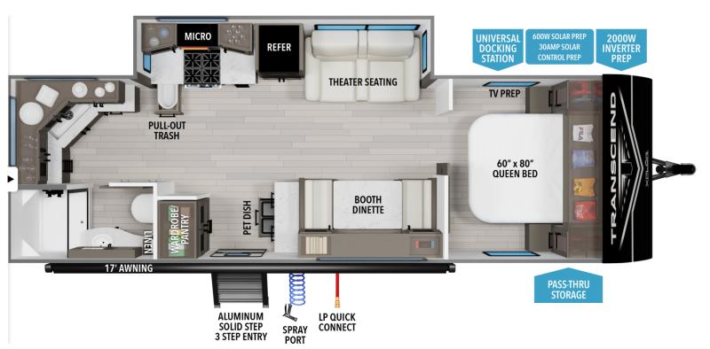 Transcend 25MLX 2026 – Roulotte moderne avec lit queen et panneaux solaires La Transcend 25MLX 2026 est une roulotte conçue pour les campeurs recherchant confort, autonomie et équipements modernes. Parfaite pour les escapades en couple ou en petite famille, elle combine un aménagement fonctionnel et des installations complètes pour profiter pleinement de chaque aventure. L’intérieur comprend une banquette, un sofa-lit, un fauteuil style théâtre, un lit queen et une télévision, offrant un espace confortable pour se détendre et se reposer. La cuisine est équipée d’un réfrigérateur 12 volts, d’un poêle à 3 ronds et d’un micro-ondes, facilitant la préparation des repas. Le confort est assuré par un air climatisé de 13 500 BTU, un chauffe-eau de 6 gallons, un chauffage de 35 000 BTU, une douche intérieure, une toilette avec réservoir, un auvent, un marche-pied et des pattes électriques pour plus de praticité. L’extérieur dispose d’un panneau solaire 200W, d’une radio Bluetooth, d’une antenne TV et d’un éclairage DEL, combinant autonomie, divertissement et confort. La Transcend 25MLX 2026 est le choix idéal pour ceux qui recherchent une roulotte compacte, moderne et bien équipée, alliant confort intérieur, technologie et plaisir en plein air pour toutes vos aventures en camping.