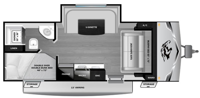 Open Range 18MBS 2026 – Compacte et polyvalente L’Open Range 18MBS 2026 est une roulotte compacte, parfaite pour les couples ou petites familles, offrant un lit queen, un lit Murphy, un sofa-lit et une banquette en U, assurant un espace de couchage flexible et confortable. Bien équipée pour toutes vos escapades, elle comprend un réfrigérateur 12 Volts, un chauffe-eau instantané, un poêle 2 ronds, un micro-ondes, un chauffage 20 000 BTU, une toilette avec réservoir, une douche intérieure, ainsi qu’un air climatisé 8 000 BTU pour les journées chaudes. À l’extérieur, profitez d’un auvent, des pattes manuelles pour le nivellement, une antenne TV et un éclairage DEL, alliant confort, praticité et autonomie. L’unité fonctionne sur 30 AMP, idéale pour des voyages simples et agréables. Le Open Range 18MBS 2026 combine polyvalence, confort et commodité pour des aventures sans compromis.