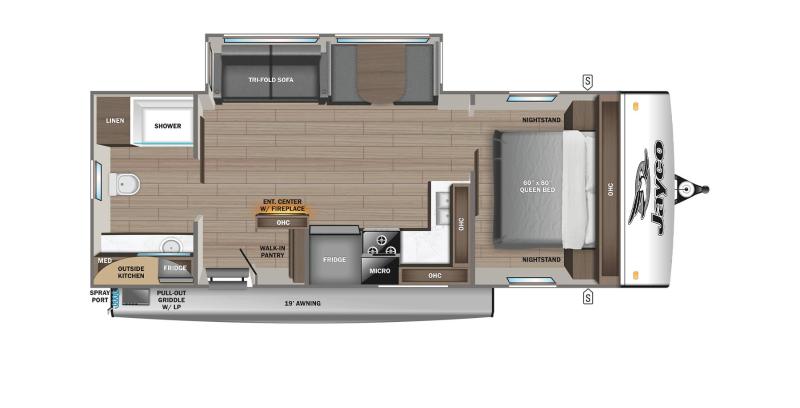 Jay Feather 25RB 2026 La Jay Feather 25RB 2026 est une roulotte moderne et bien équipée, idéale pour les familles ou les couples qui recherchent confort, autonomie et praticité sur la route. L’intérieur comprend un sofa-lit, une banquette, un fauteuil de style théâtre, un lit queen et un foyer, offrant un espace de vie convivial et chaleureux. La cuisine est complète avec un réfrigérateur 12 Volts, un poêle 3 ronds, un fourneau et un micro-ondes, idéale pour préparer vos repas facilement. La cuisinette extérieure permet de profiter pleinement des repas en plein air. Pour le confort et l’autonomie, cette unité dispose d’un air climatisé de 13 500 BTU, d’un chauffe-eau instantané, d’un chauffage de 12 000 BTU, d’un auvent, de pattes électriques et d’un panneau solaire de 200W. Les haut-parleurs extérieurs, la radio Bluetooth et l’éclairage DEL complètent l’expérience, assurant divertissement et praticité à l’intérieur comme à l’extérieur. Construite avec la technologie Azdel et une structure en aluminium, cette roulotte combine légèreté, durabilité et robustesse pour toutes vos aventures.