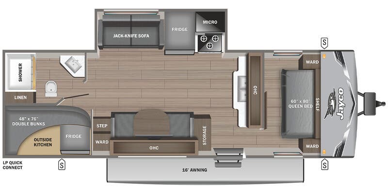 Jayflight 265BHS 2025 Le Jayflight 265BHS 2025 est idéal pour les familles et les aventuriers qui recherchent confort et praticité en voyage. Couchages et espace : lit queen, sofa-lit et lits superposés pour accueillir toute la famille ou les amis. Cuisine complète : fourneau, poêle 3 ronds, micro-onde, réfrigérateur 12 V et cuisinette extérieure pour préparer vos repas facilement, à l’intérieur comme à l’extérieur. Confort et commodités : air climatisé 15 000 BTU, chauffe-eau instantanée, douche intérieure et toilette avec réservoir, chauffage 25 000 BTU pour un confort optimal en toutes saisons. Extérieur et loisirs : auvent, douchette extérieure, hauts-parleurs extérieurs et panneau solaire 200 W pour profiter pleinement de la vie en plein air. Divertissement et technologie : radio bluetooth, antenne TV et éclairage DEL pour un séjour agréable et pratique. Électricité et sécurité : 30 AMP et pattes électriques pour un branchement facile et stable. Le Jayflight 265BHS 2025 combine espace, confort et fonctionnalités pour des aventures mémorables sur la route.
