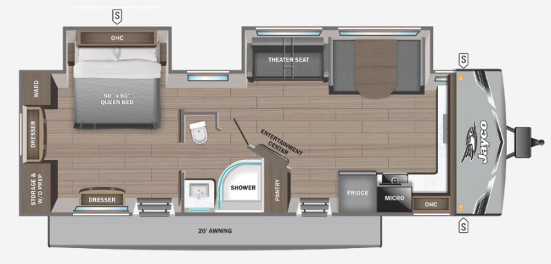 Jay Flight 280FKS 2026 – Confort, style et autonomie La Jay Flight 280FKS 2026 est une caravane bien pensée qui combine espace de vie confortable et équipements modernes, idéale pour les couples ou les campeurs qui aiment voyager avec style. L’aire de vie comprend une banquette, des fauteuils style théâtre et un foyer, créant une ambiance chaleureuse et conviviale. La cuisine avant est équipée de : Réfrigérateur 12 Volts Fourneau Micro-onde Chauffe-eau instantané Pour un confort optimal : Air climatisé 15 000 BTU Service 30 AMP Préparation laveuse/sécheuse Panneau solaire 200W Équipements supplémentaires : Lit queen Jantes en aluminium Douchette extérieure Auvent Radio Bluetooth Antenne TV Hauts-parleurs extérieurs Points forts : Jay Flight 280FKS modèle 2026 Foyer Fauteuils style théâtre Lit queen Panneau solaire 200W Préparation laveuse/sécheuse Air climatisé 15 000 BTU La Jay Flight 280FKS 2026 offre un excellent équilibre entre confort, autonomie et fonctionnalité, parfaite pour profiter pleinement de la saison de camping.