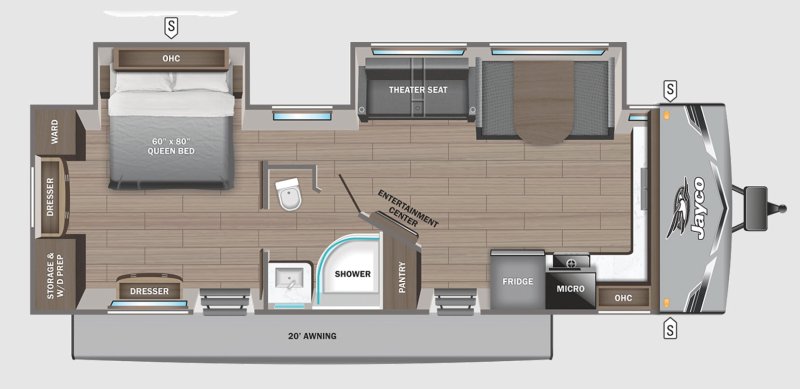 Découvrez la Jayco JayFlight 280FKS 2026, une roulotte spacieuse et élégante à vendre, parfaite pour les couples ou voyageurs recherchant confort et fonctionnalité en camping. Son aménagement avant-cuisine (Front Kitchen) offre un espace généreux et pratique pour cuisiner grâce au réfrigérateur 12 volts, au fourneau avec poêle 3 ronds et au micro-onde. La banquette et les fauteuils style théâtre créent un espace de détente confortable, idéal pour relaxer devant votre émission préférée. La chambre principale est équipée d’un lit queen et d’une préparation laveuse-sécheuse, un atout appréciable pour les séjours prolongés. Pour un confort optimal en toute saison, cette roulotte comprend un air climatisé 15 000 BTU, un chauffage 35 000 BTU ainsi qu’un chauffe-eau instantané. Le branchement 30 AMP et le panneau solaire 200W assurent autonomie et polyvalence selon votre type de camping. À l’extérieur, profitez d’un auvent, d’une radio Bluetooth et d’une antenne TV pour agrémenter vos moments en plein air. La Jayco JayFlight 280FKS 2026 combine espace, confort et équipements modernes, faisant d’elle un excellent choix pour ceux qui souhaitent une roulotte fiable et bien équipée, prête pour l’aventure.