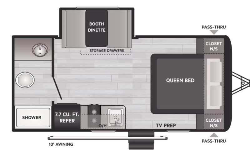 Hideout 179RB 2024 Le Hideout 179RB 2024 est une unité compacte et fonctionnelle, idéale pour les couples ou les petites familles à la recherche de confort et de praticité lors de leurs escapades. Elle offre des équipements modernes et un espace bien pensé pour un séjour agréable : Espaces de vie : chambre principale avec lit queen et banquette pour accueillir confortablement plusieurs personnes. Cuisine et repas : réfrigérateur 12 Volts, poêle 2 ronds et micro-onde pour préparer facilement vos repas. Confort et commodités : double air climatisé 13 500 BTU et 15 000 BTU, chauffe-eau instantané, 30 AMP, pattes manuelles, douche intérieure et toilette avec réservoir pour un séjour agréable en toutes saisons. Divertissement et extérieur : antenne TV, panneau solaire 200 W, éclairage DEL et auvent pour profiter pleinement du plein air. Praticité : marche-pied intégré pour un accès facile à l’unité. Le Hideout 179RB 2024 est parfait pour ceux qui recherchent une unité compacte, bien équipée et autonome pour des aventures mémorables.