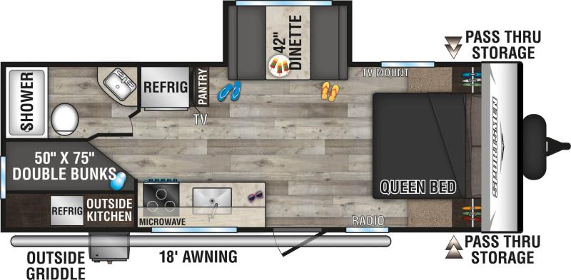 Sportsmen 231BHKSE 2023 – Roulotte compacte avec lits superposés et cuisine extérieure La Sportsmen 231BHKSE 2023 est une roulotte compacte et fonctionnelle, idéale pour les familles ou les couples recherchant confort, praticité et simplicité lors de leurs escapades en camping. Elle combine un aménagement intelligent avec les équipements essentiels pour profiter pleinement de chaque aventure. L’intérieur comprend un lit queen, une banquette, des lits superposés et un marche-pied, offrant un espace flexible et confortable pour dormir et se détendre. La cuisinette extérieure permet de préparer facilement vos repas tout en profitant de l’air frais. Cette roulotte est parfaite pour ceux qui souhaitent une option compacte, pratique et bien pensée, offrant confort intérieur et flexibilité pour des escapades en plein air sans compromis sur le plaisir.
